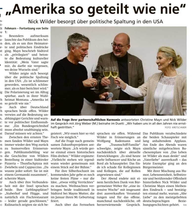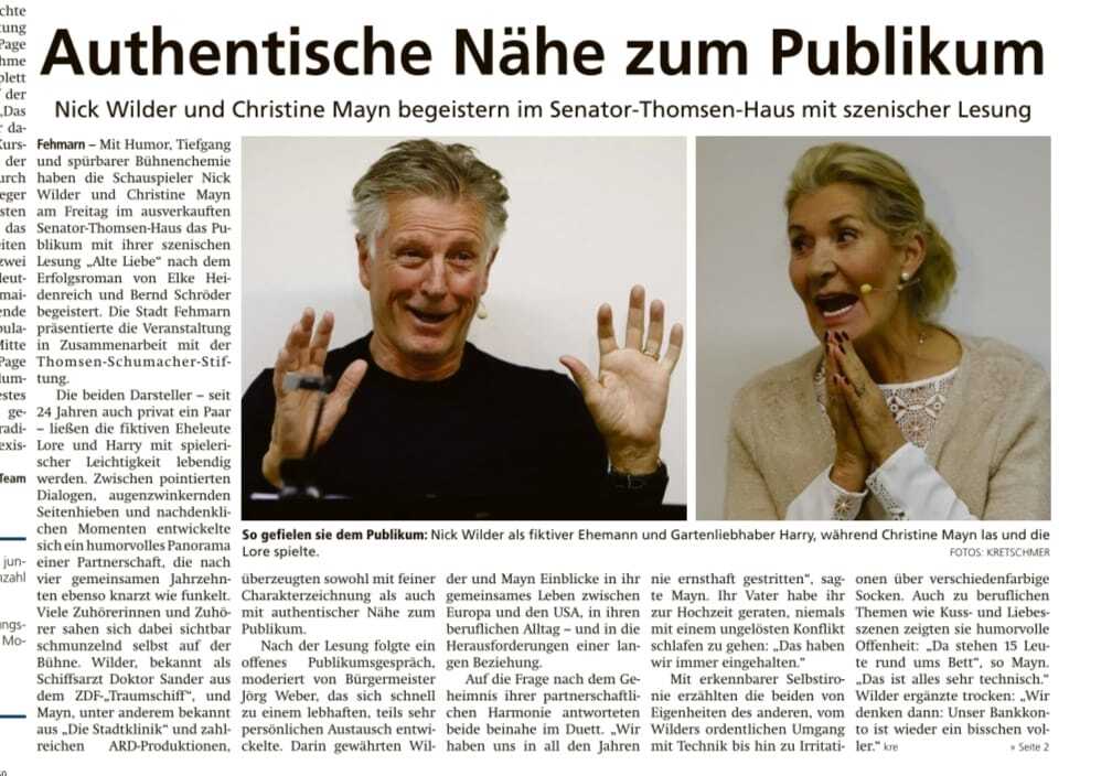 Fehmarn - Mit Humor, Tiefgang und spürbarer Bühnenchemie haben die Schauspieler Nick Wilder und Christine Mayn am Freitag im ausverkauften Senator-Thomsen-Haus das Publikum mit ihrer szenischen Lesung „Alte Liebe“ nach dem Erfolgsroman von Elke Heidenreich und Bernd Schröder begeistert. Die Stadt Fehmarn präsentierte die Veranstaltung in Zusammenarbeit mit der Thomsen-Schumacher-Stiftung.