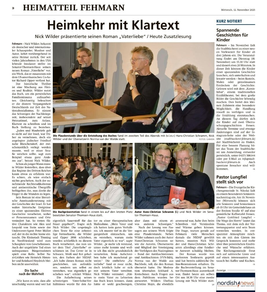 Im November stehen zwei besondere Literaturveranstaltungen an: Der Schauspieler, Musiker und Autor Nick Wilder kehrt auf seine Heimatinsel zurück und präsentiert am 10. November (Montag) um 18.30 Uhr im Senator-Thomsen-Haus in Burg seinen neuen Roman "Vaterliebe". Wie die Stadt Fehmarn mitteilt, handelt es sich dabei nicht nur um eine Buchpremiere, sondern um eine Rückehr an die Wurzeln und eine literarische Auseinandersetzung mit der Geschichte der Insel.